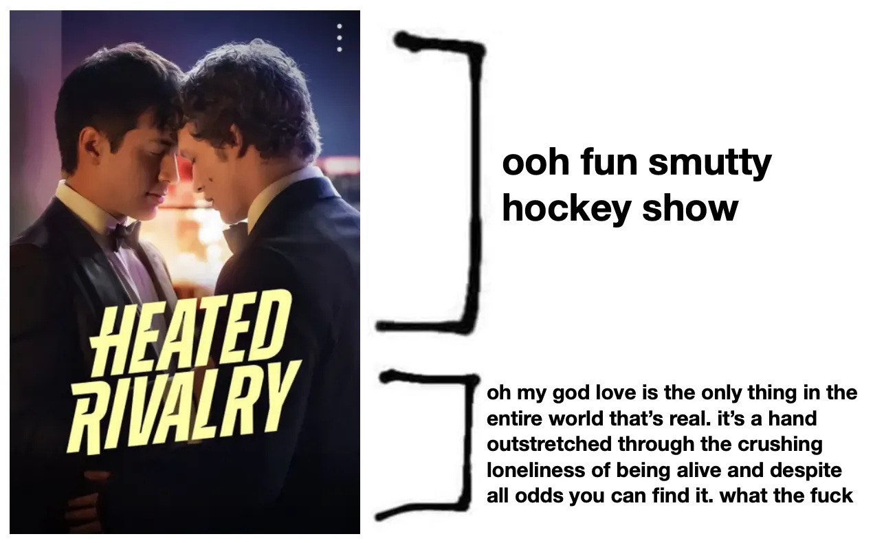 Its easy to understand the appeal. Cynicism is prophylactic. It allows us to walk through a deeply scarred, imperfect world without being swallowed up and destroyed by its horrors. It allows us to compartmentalize the news we see on our screens, sigh, and then go back to finishing the email due by the end of the business day. It deadens us and desensitizes us from feeling anything too much amid the tragedies. It allows us to reconcile the dissonance between the toxicity all around us, and our desperate yearning to breathe in something that doesn’t make us sick. Heated Rivalry is like a gust of fresh air that blew in from Canada.